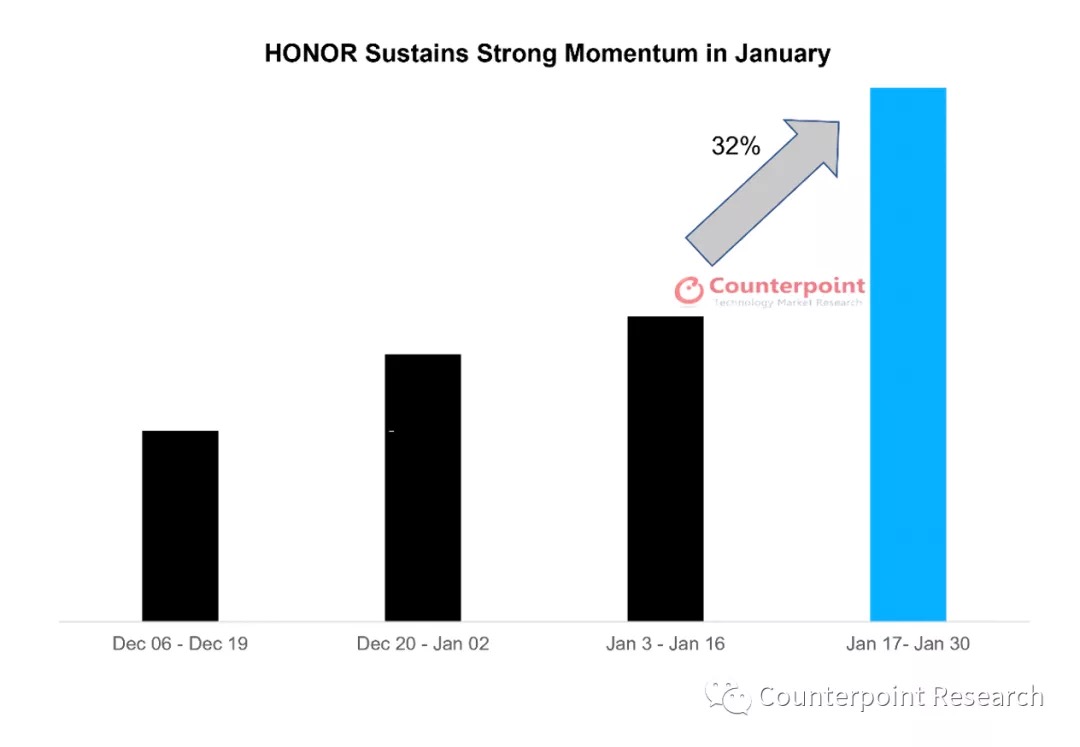 荣耀强势回归后,其商场比例在第四季度我国商场的排名初次升至第二,较去年同期翻番。