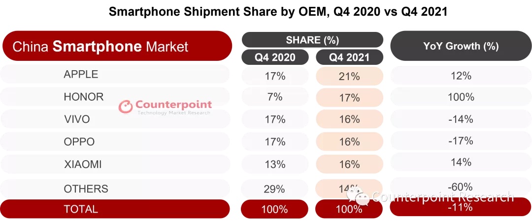 依据Counterpoint Research Market Monitor发布的最新数据,2021年第四季度我国智能手机出货量同比下降11%。厂商之间竞赛剧烈,苹果位列榜首,并到达其有史以来最高的商场比例。